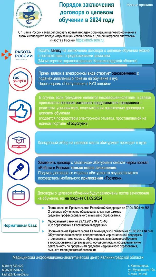 постановлением Правительства Российской Федерации от 27.04.2024 № 555 «О целевом обучении по образовательным программам среднего профессионального и высшего образования».